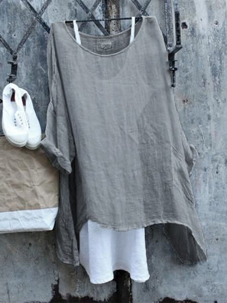 Gray Cotton Casual Crew Neck Solid Shirts & Tops