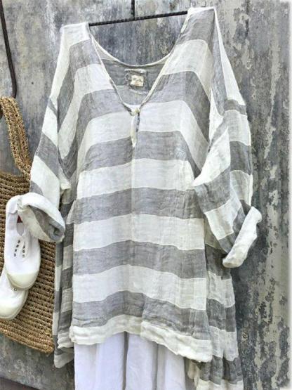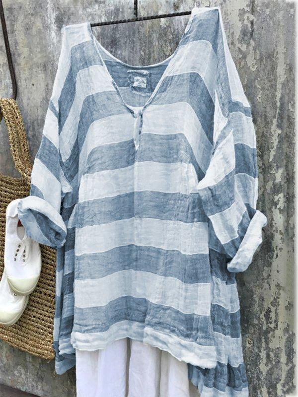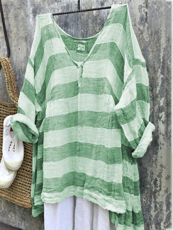 Casual Long Sleeve V Neck Striped Bat Sleeve Tops